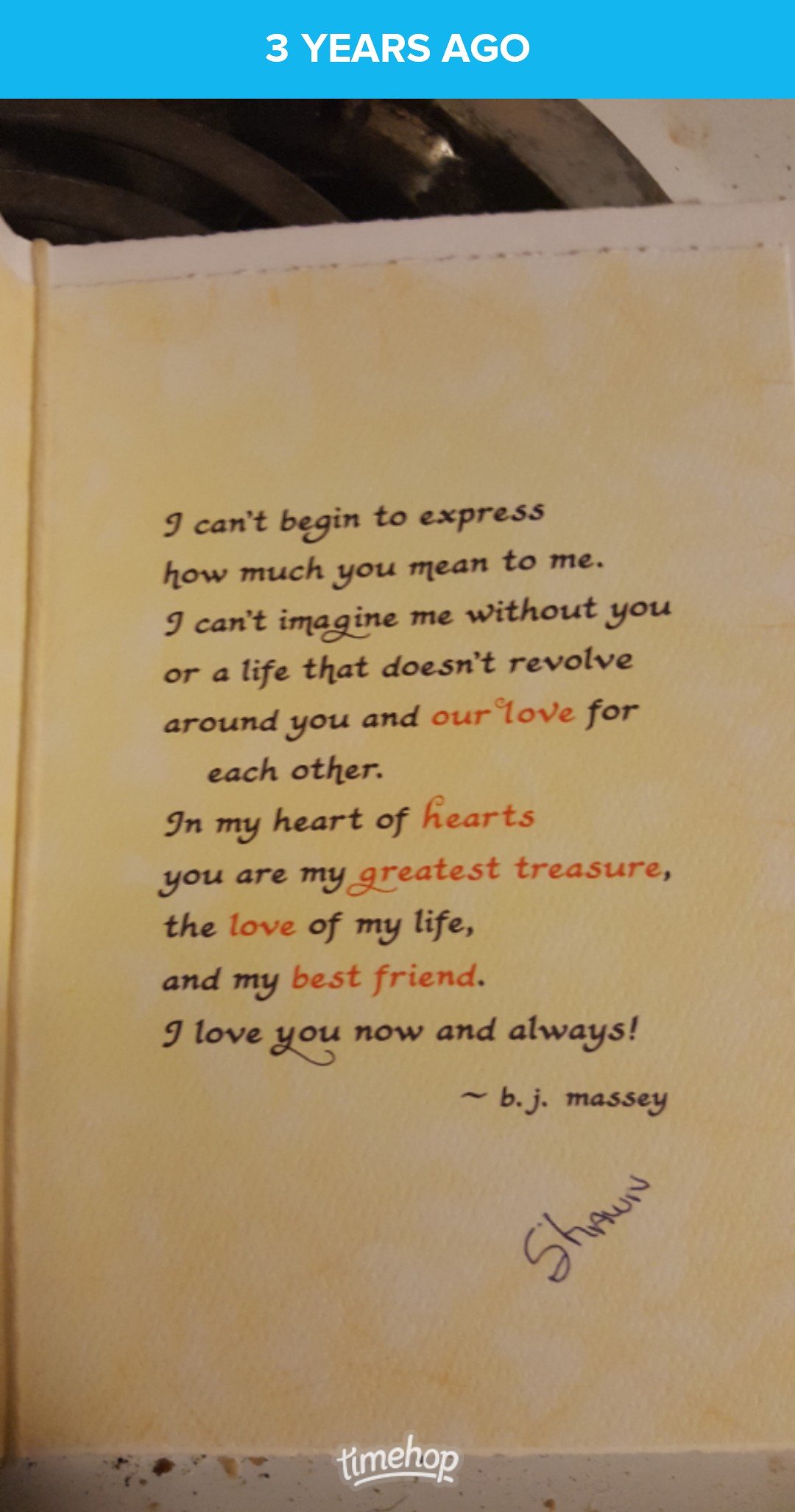 My Timehop app tells me things everyday that we did together. Whether its eating at our favorite restaurant, camping or going in a trip together. Every day there is a memory of us together. Guess that’s why I miss him so much. There wasn’t a day that went by that we weren’t together. It reminded me that he picked me up from the airport 3 years ago with roses and a wonderful card. He said he didn’t need to write in the card because it said everything he wanted to say.